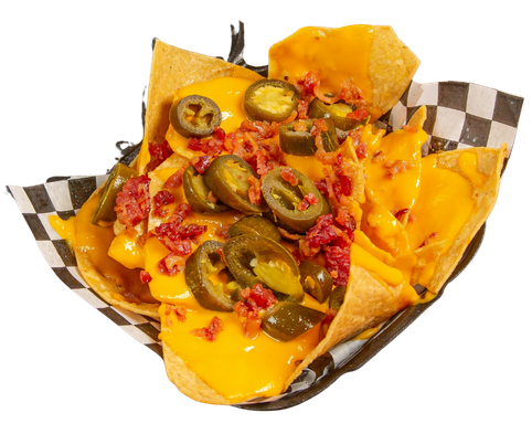 Crispy tortilla chips topped with beans, guacamole melted cheddar cheese and jalapeños.